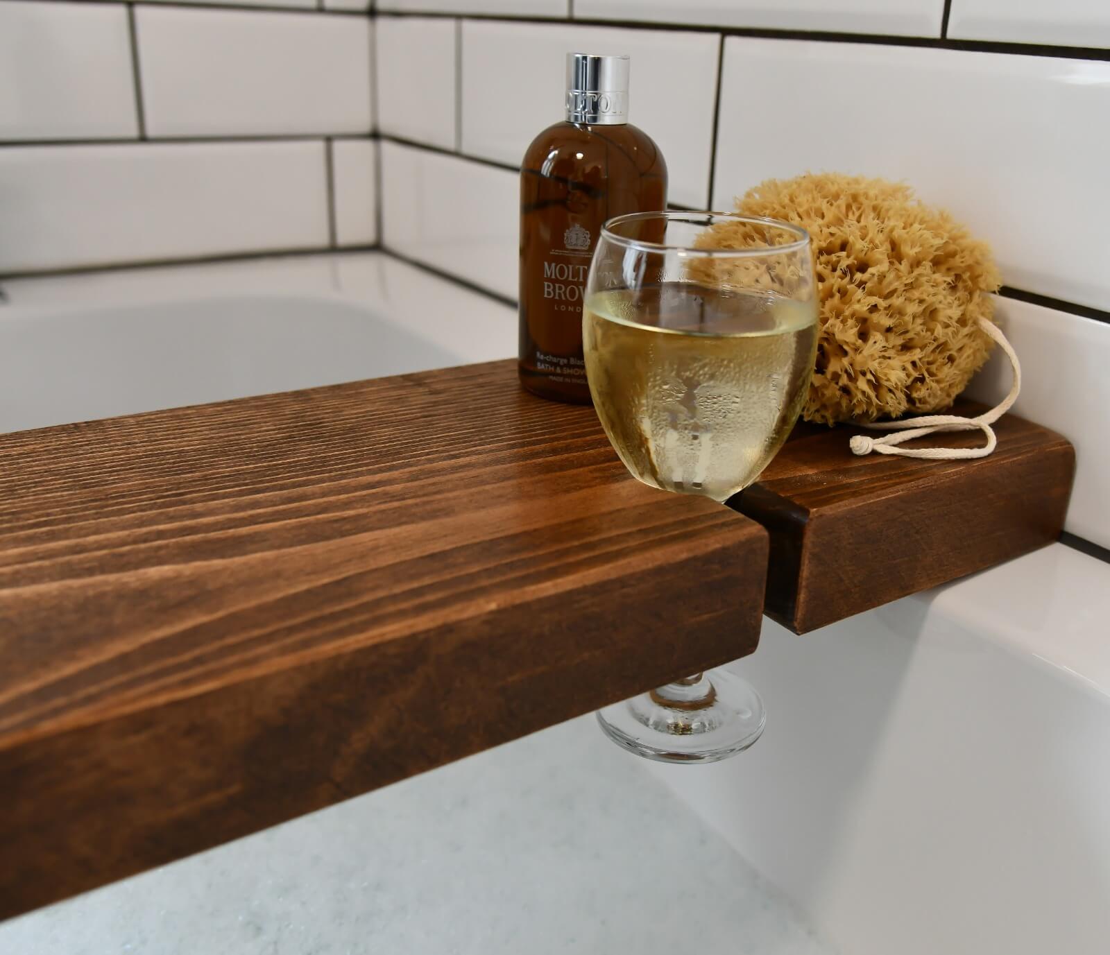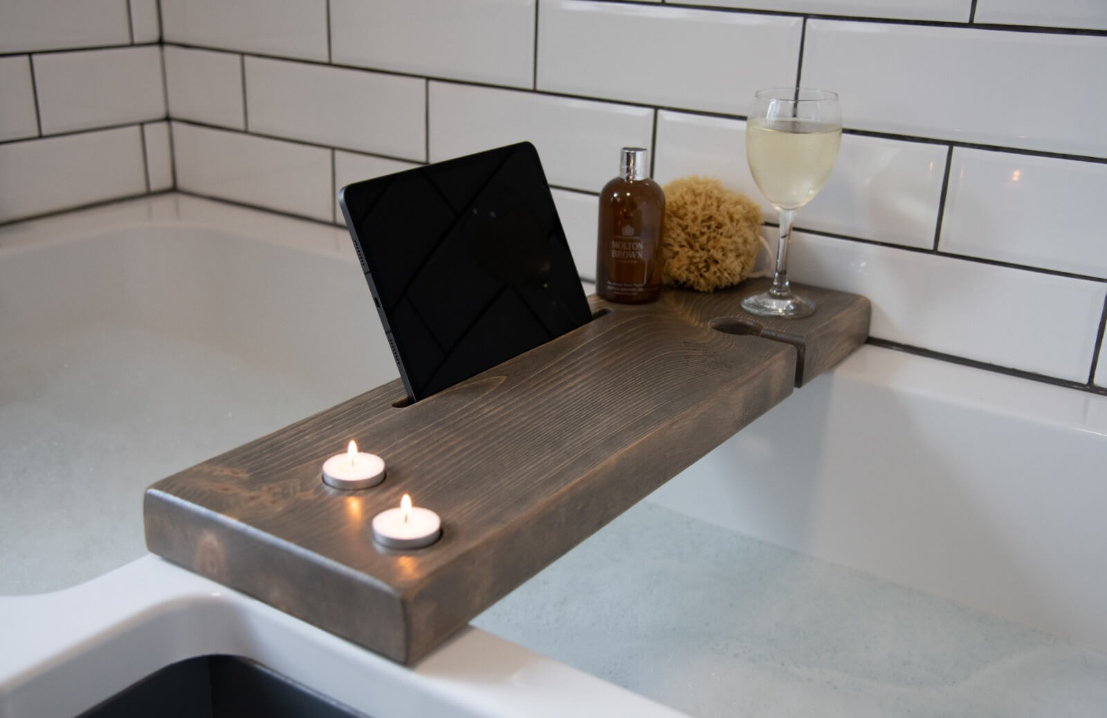 Complete with a wine glass holder, a groove to hold an iPad/tablet, and two tealight candle holders, this bath board will transform your bath time into a relaxing and indulgent experience. The durable waterproof hardwax oil finish and a wide choice of colors make this bath board suitable for any bathroom decor.