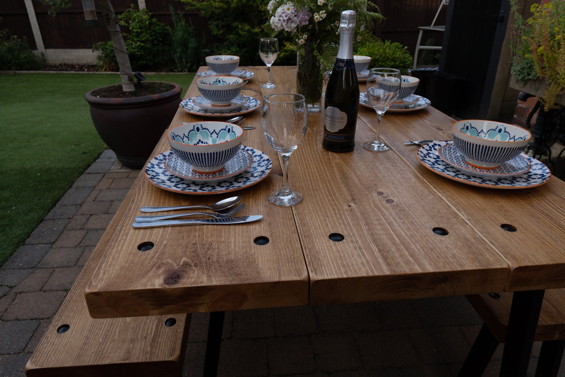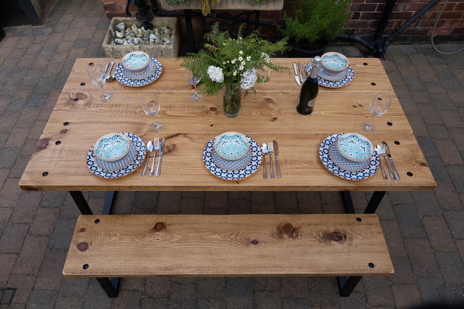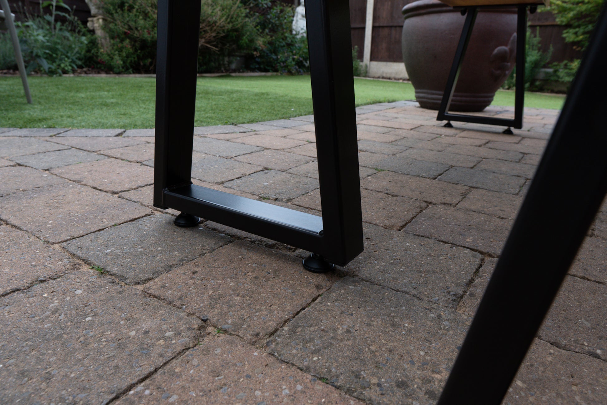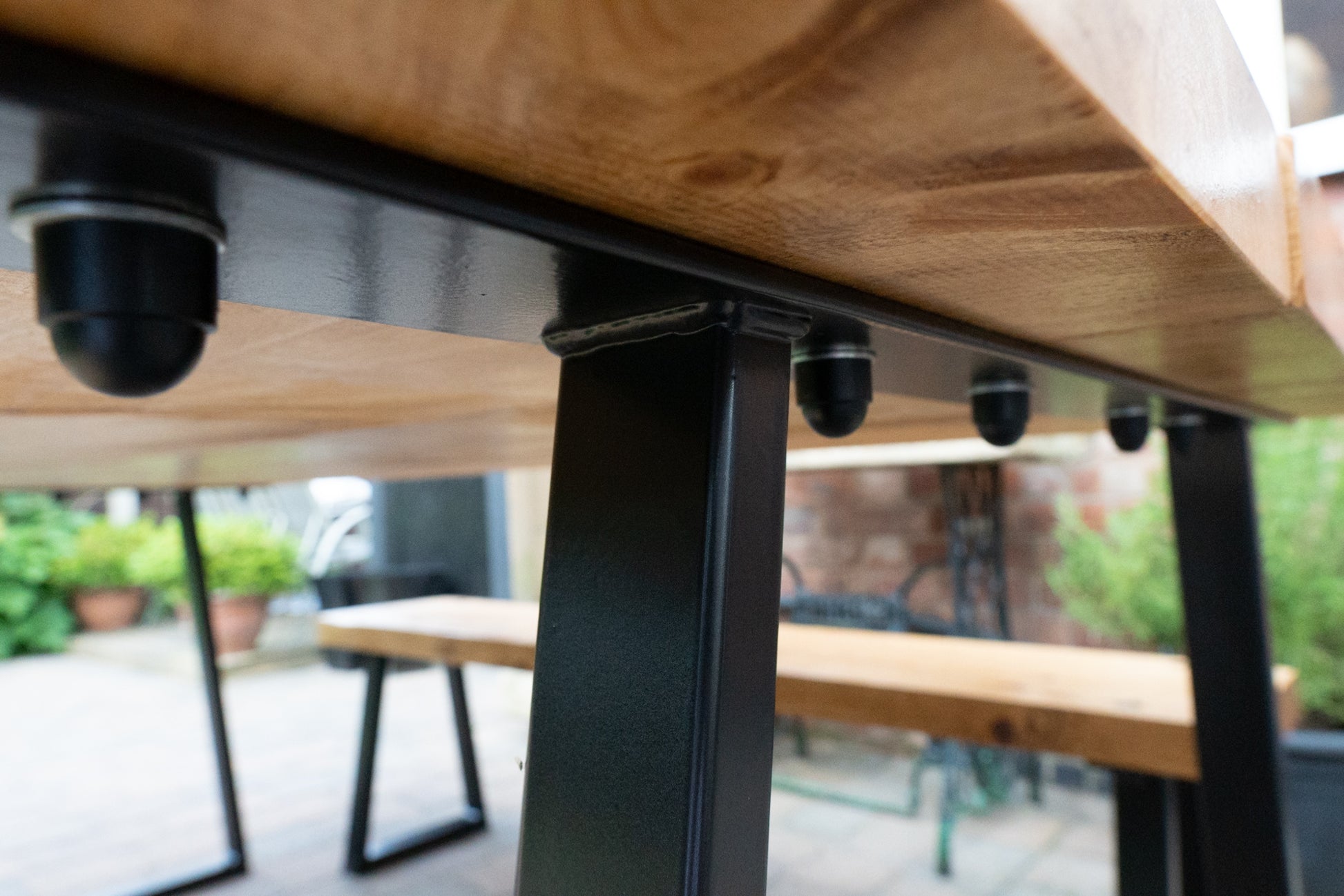 The Outdoor Arkwright industrial style table and benches come equipped with levelling feet, a helpful feature for any uneven surfaces. For enhanced strength and distinctive character, we have incorporated through bolts into the design, which are powder coated to match your chosen colour scheme.