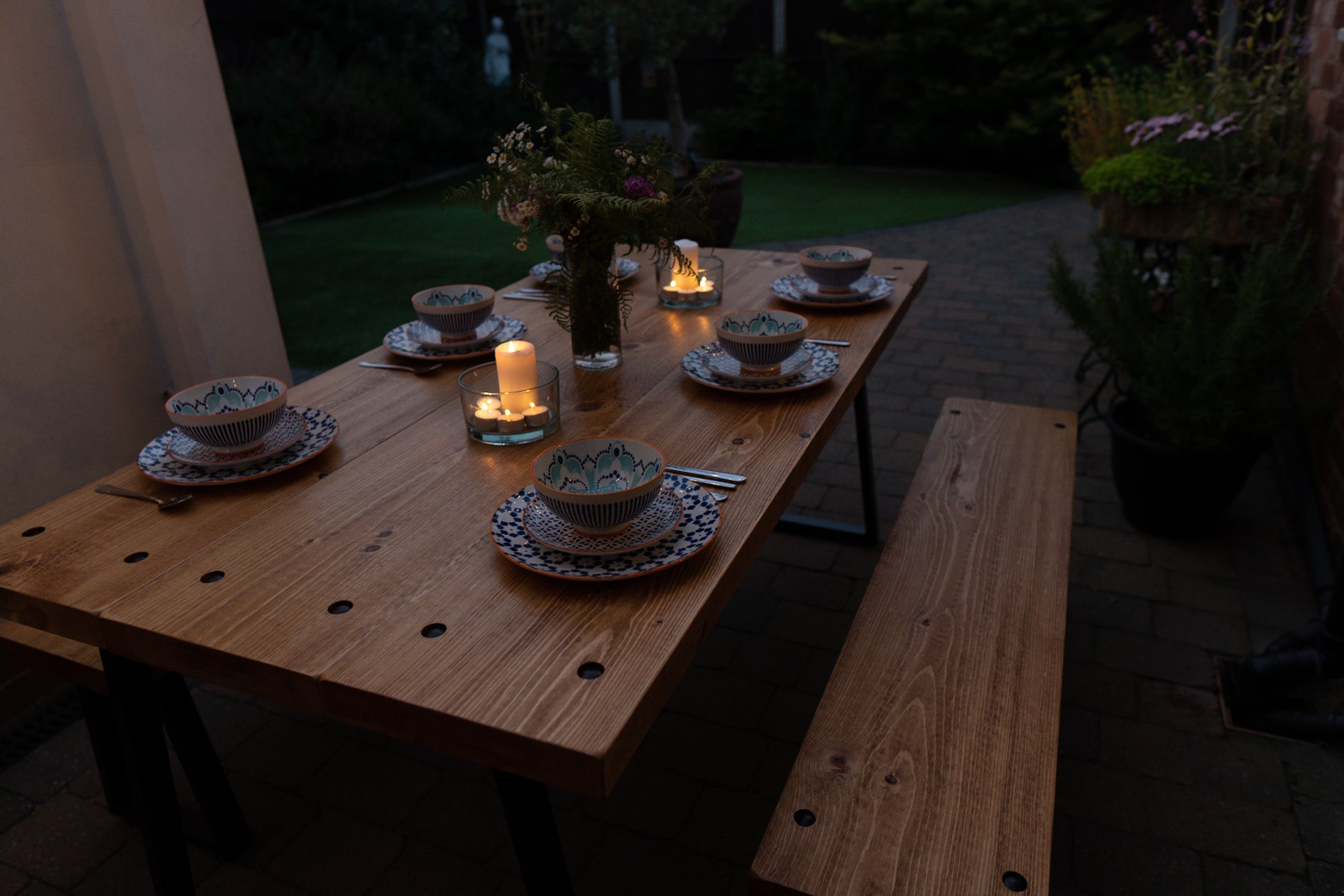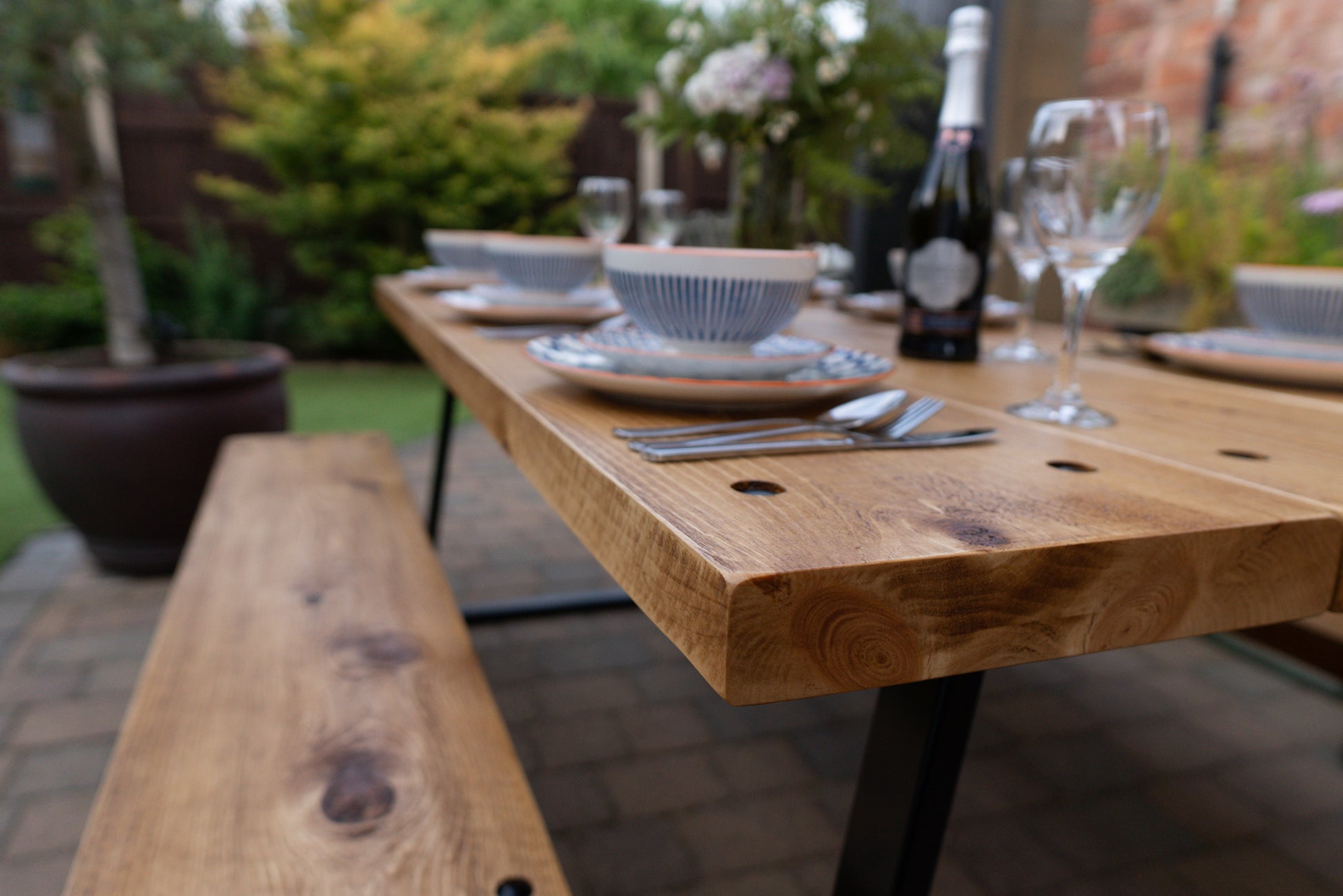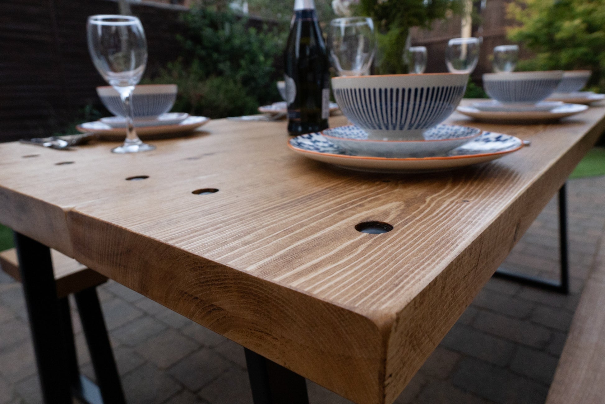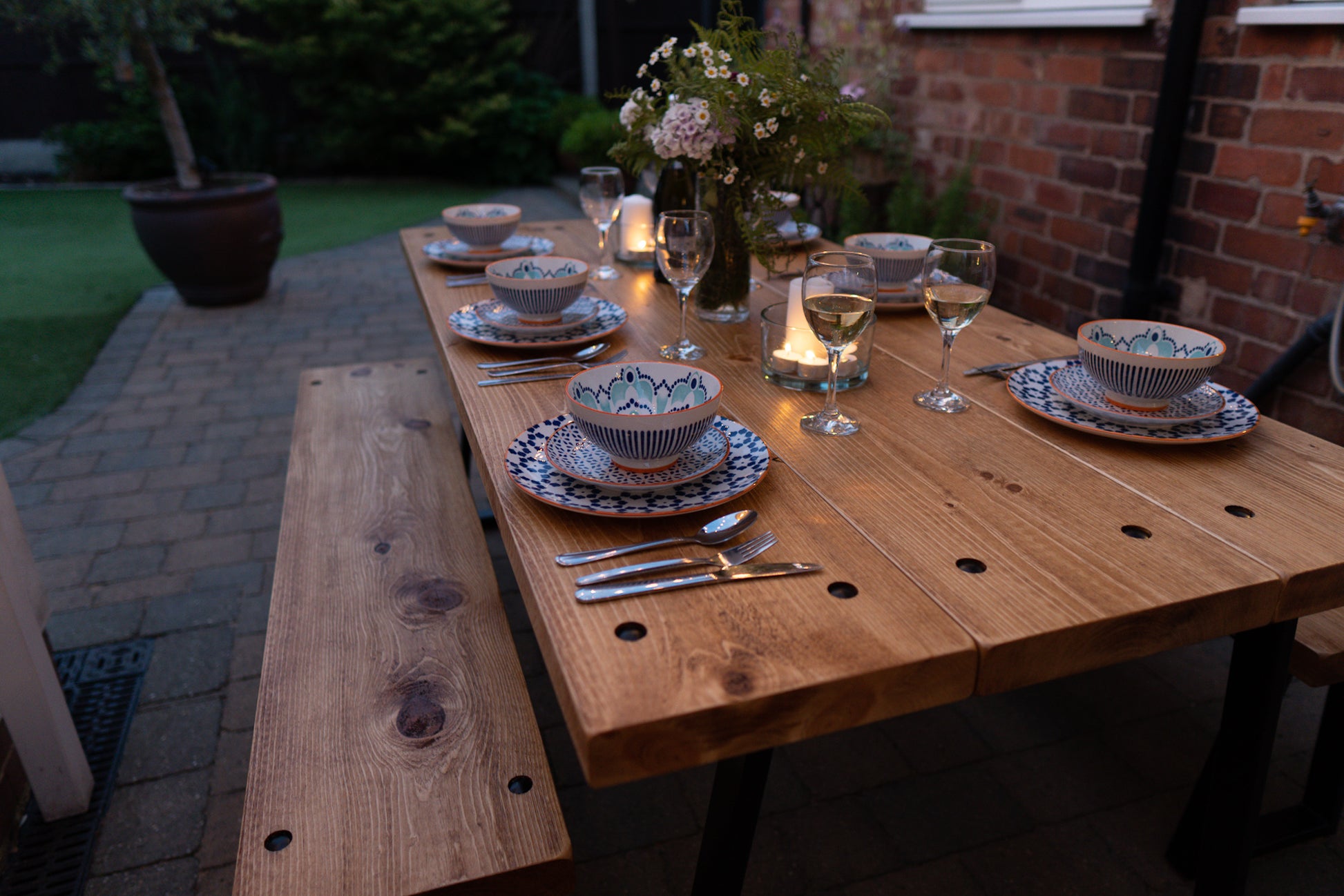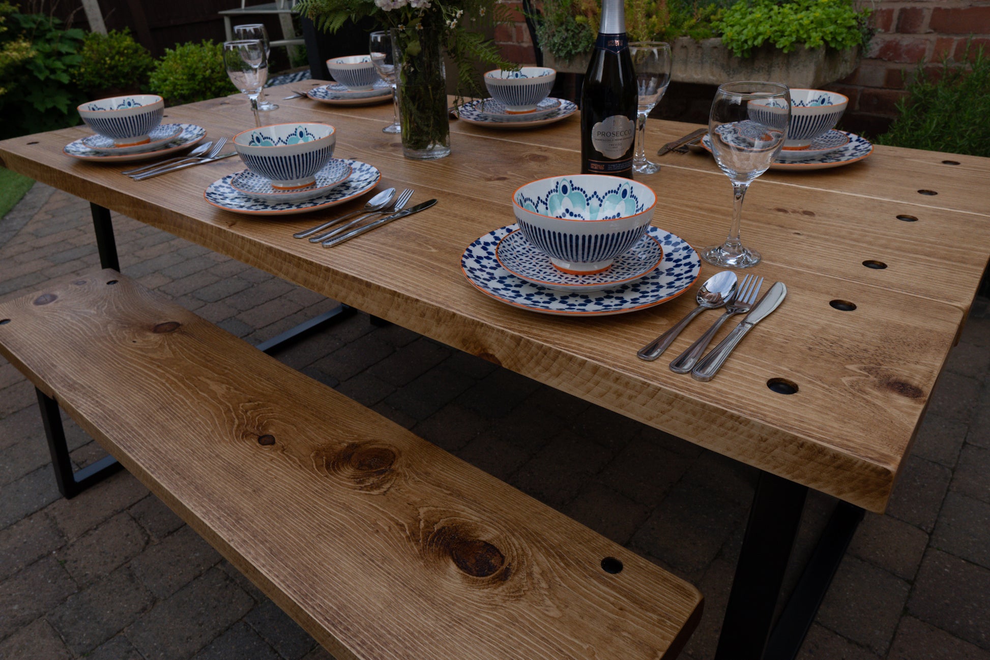 The Outdoor Arkwright industrial style table and benches come equipped with levelling feet, a helpful feature for any uneven surfaces. For enhanced strength and distinctive character, we have incorporated through bolts into the design, which are powder coated to match your chosen colour scheme.